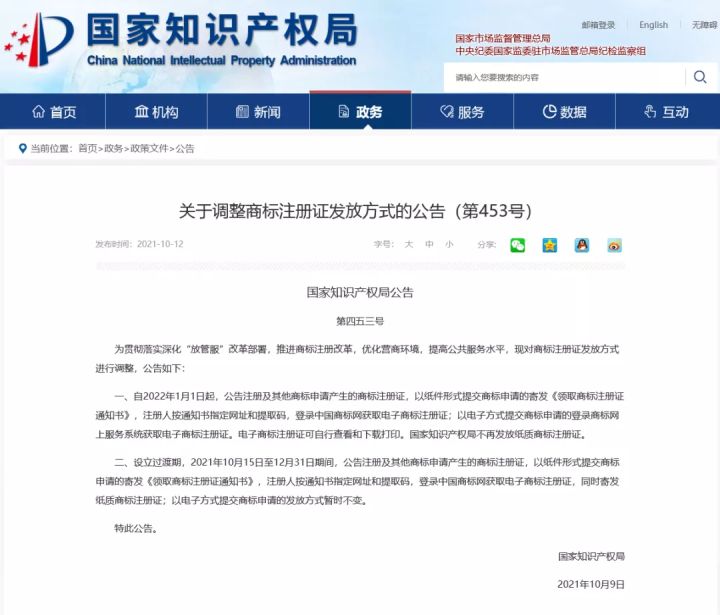 國家知識(shí)產(chǎn)權(quán)局官網(wǎng)發(fā)布公告,2022年1月1日起全面取消紙質(zhì)商標(biāo)注冊(cè)證書!相關(guān)內(nèi)容如下: