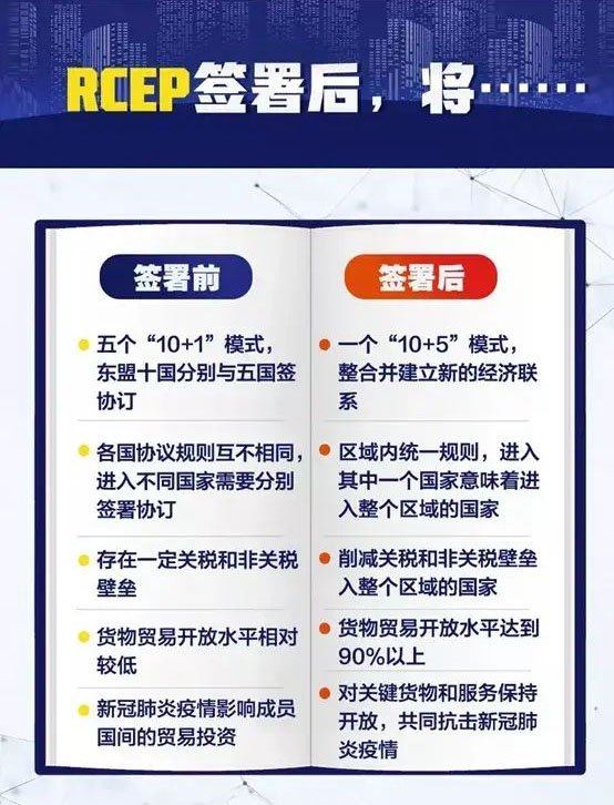 RCEP是一個綜合性自由貿(mào)易協(xié)定,由東盟十國在2012年發(fā)起,歷經(jīng)八年談判,于2019年11月4日完成談判,并于2020年11月15日正式簽署“區(qū)域全面經(jīng)濟伙伴關(guān)系協(xié)定”(RCEP)。2021年11月2日,成立自由貿(mào)易協(xié)定RCEP,該協(xié)議將于2022年1月1日起正式生效。