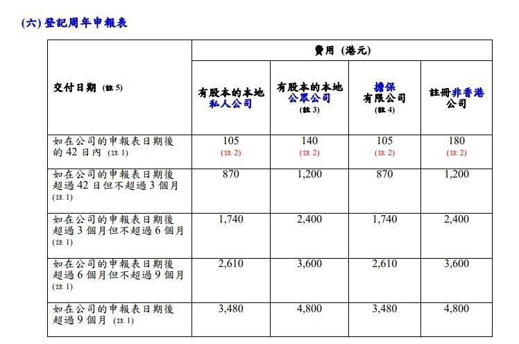 6.不年審的后果主要有兩方面,一方面是會產(chǎn)生罰款,商業(yè)登記證更新的罰款是300港元每年,寬限期是30天,周年申報表的罰款是870港幣每個季度,可參照下圖。如果持續(xù)欠費會收到法院傳票,如果還是拒絕上庭與處理將會面臨更多的罰款以及公司強制被除冊,留下不良記錄,對以后再次擔任公司股東董事還有銀行開戶以及香港出入境都會有影響。