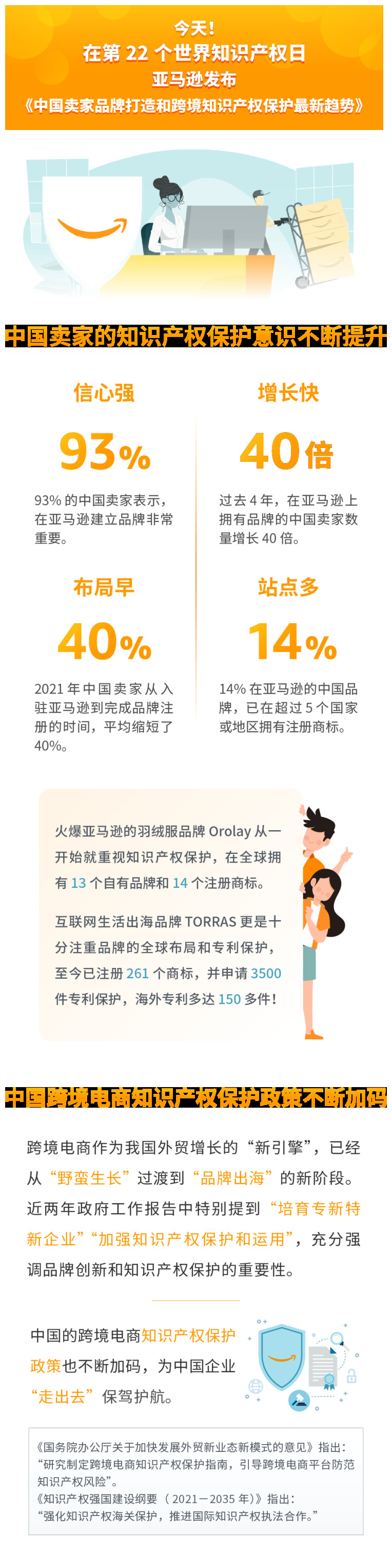 隨著經(jīng)濟(jì)的發(fā)展,跨境電商賣家對知識產(chǎn)權(quán)、對品牌日漸重視,在第22個世界知識產(chǎn)權(quán)日亞馬遜發(fā)布了《中國賣家品牌打造和跨境知識產(chǎn)權(quán)保護(hù)最新趨勢》。