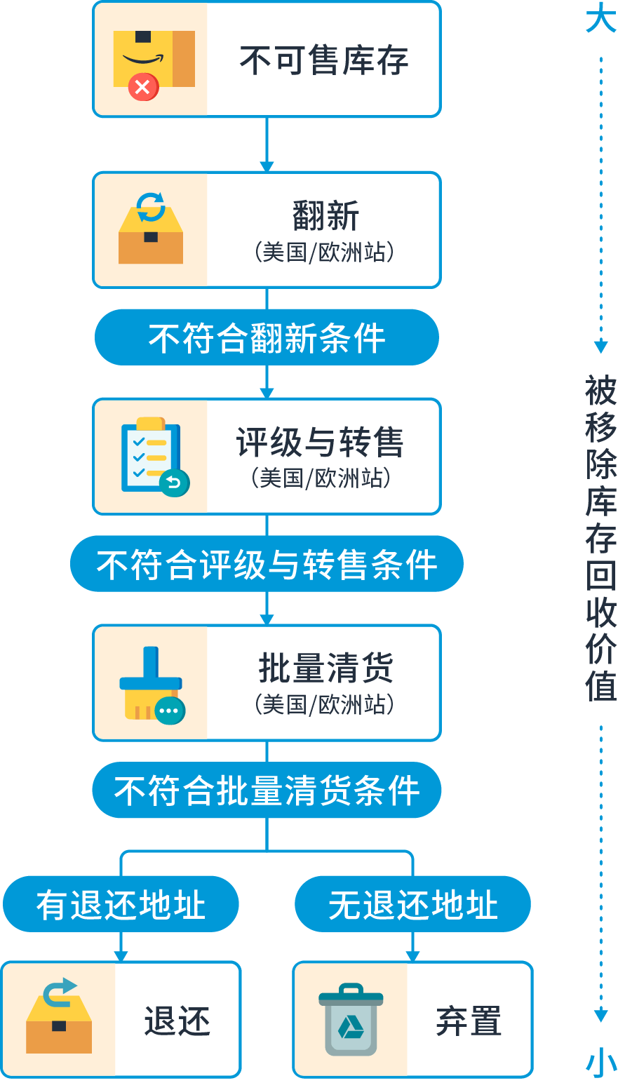 不可售商品的自動(dòng)移除是指在亞馬遜運(yùn)營中心的不可售庫存無須手動(dòng)設(shè)置,將會(huì)被自動(dòng)設(shè)定為“自動(dòng)移除”,亞馬遜為這些不可售庫存增加了價(jià)值回收選項(xiàng)。