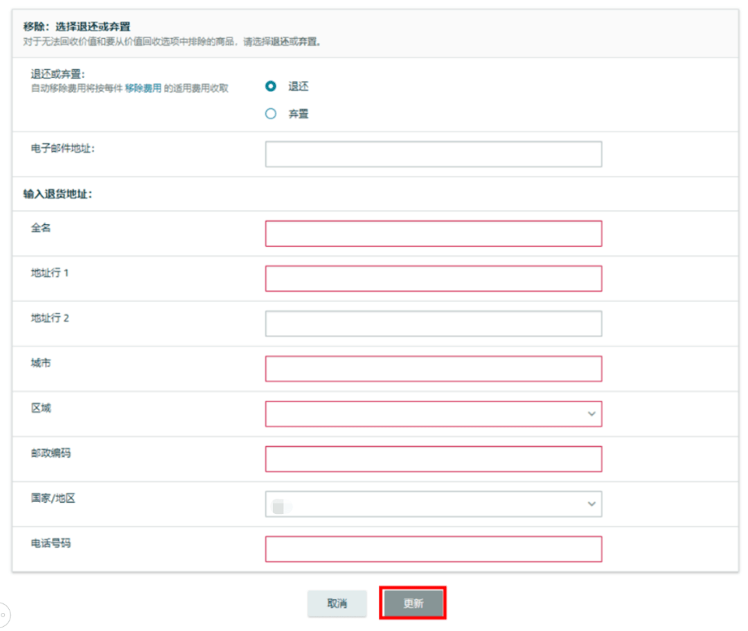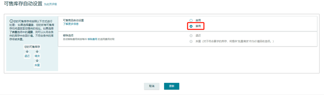 1、若您希望通過“自動(dòng)移除”定期清理您的超齡和閑置庫存并退回至指定地址,您需要在該頁面提供您的退貨地址,再點(diǎn)擊【更新】完成設(shè)置。