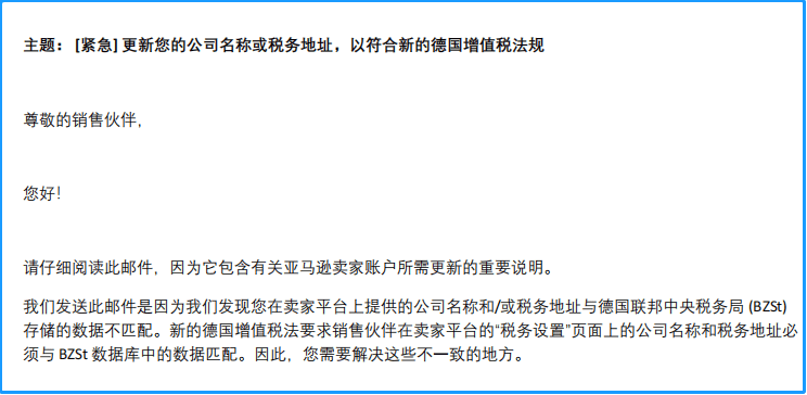 首先是稅務(wù)合規(guī)方面,您需要符合德國(guó)增值稅法規(guī)要求,除了確保VAT有效性之外。根據(jù)德國(guó)稅局要求,您還需要確保您在賣家平臺(tái)的地址和稅局的一致性。最近,有很多德國(guó)站點(diǎn)的賣家,收到了亞馬遜發(fā)出《[緊急]更新您的公司名稱或稅務(wù)地址,以符合新的德國(guó)增值稅法規(guī)》的業(yè)績(jī)通知,要求賣家對(duì)VAT證書上面的公司名稱/地址與亞馬遜賣家平臺(tái)的信息保持一致。