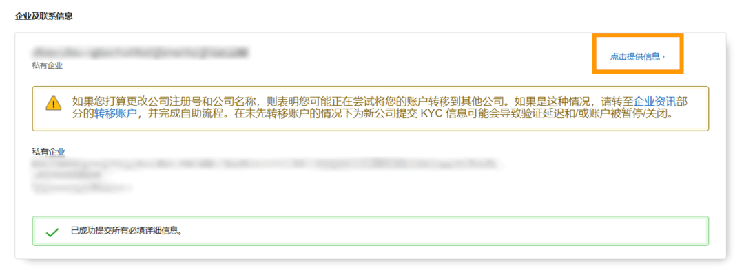 ② 單擊法人實(shí)體名稱旁邊的“點(diǎn)擊提供信息”,以便您可以更新法定企業(yè)名稱;