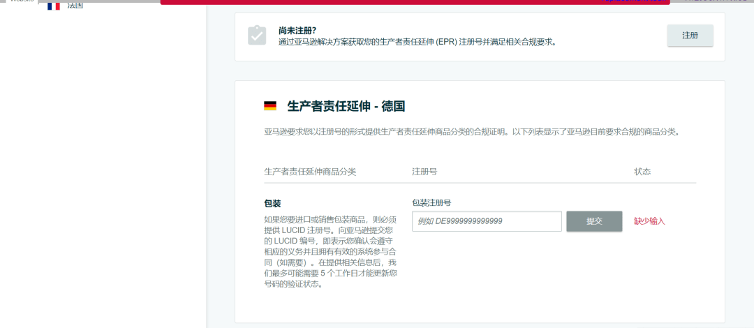 除了符合德國(guó)稅務(wù)要求之外,您需要關(guān)注生產(chǎn)者責(zé)任延伸(EPR)相關(guān)義務(wù)的履行。如果您的商品因德國(guó)包裝法不合規(guī)而受亞馬遜采取強(qiáng)制措施,請(qǐng)參考以下內(nèi)容,對(duì)采取措施的商品進(jìn)行恢復(fù)。