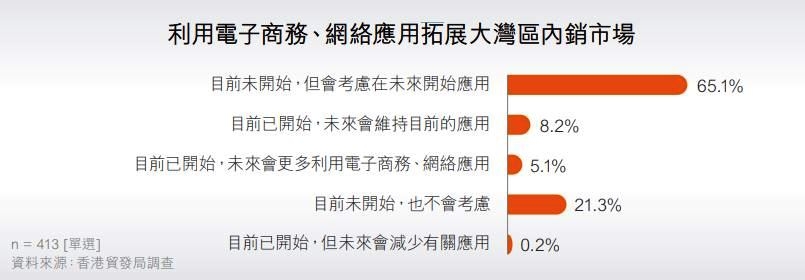 電子商務(wù)及網(wǎng)絡(luò)應(yīng)用近年急速發(fā)展,通過(guò)互聯(lián)網(wǎng)的各種電子交易盛行,包括供應(yīng)鏈管理有關(guān)的電子數(shù)據(jù)交換應(yīng)用,以及網(wǎng)絡(luò)行銷和網(wǎng)購(gòu)活動(dòng)等大行其道。雖然如此,受訪企業(yè)當(dāng)中,只有不到14%受訪企業(yè)表示目前已開始利用電子商務(wù)、網(wǎng)絡(luò)應(yīng)用拓展大灣區(qū)的內(nèi)銷市場(chǎng),包括8.2%未來(lái)會(huì)維持目前的應(yīng)用,及5.1%未來(lái)會(huì)更多利用電子商務(wù)、網(wǎng)絡(luò)應(yīng)用。雖然如此,大部分受訪企業(yè)表示會(huì)考慮在未來(lái)開始應(yīng)用(65.1%),只有21.3%表示目前未開始、也不會(huì)考慮有關(guān)應(yīng)用。