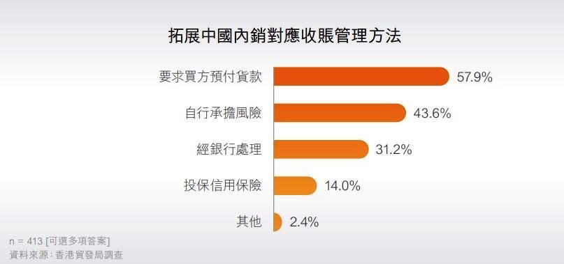 對(duì)于如何妥善管理內(nèi)銷的應(yīng)收賬款,有57.9%受訪企業(yè)表示會(huì)要求買方預(yù)付貨款,43.6%則會(huì)自行承擔(dān)風(fēng)險(xiǎn)。另一方面,31.2%會(huì)經(jīng)銀行處理有關(guān)應(yīng)收賬款,及14.0%會(huì)投保信用保險(xiǎn)。也有小部分(其他:2.4%)表示沒(méi)有或不知道有甚么方法管理應(yīng)收賬。