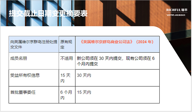 注冊(cè)代理人須在提交前核實(shí)信息,并在 30 天內(nèi)及時(shí)更新任何變更。在修訂法生效日期前成立的英屬維爾京群島實(shí)體,須在六個(gè)月內(nèi)遵守上述規(guī)定。