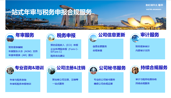新加坡公司年審和稅務申報是確保企業(yè)合規(guī)運營的重要環(huán)節(jié),及時、準確地完成這些工作不僅能避免罰款和處罰,還能為企業(yè)的長期發(fā)展奠定堅實基礎。提前規(guī)劃、妥善準備,并借助專業(yè)團隊的力量,確保企業(yè)合規(guī)運營。針對新加坡公司年審和稅務申報,RICHFUL瑞豐可以為您提供以下專業(yè)服務: