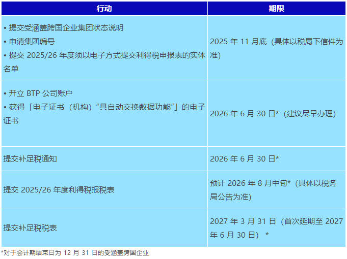 以下內(nèi)容概述受蓋跨國(guó)企業(yè)集團(tuán)在新制度下的相關(guān)義務(wù)以及規(guī)定期限。
