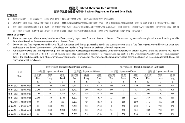 根據(jù)稅務局公布的收費表,在 2026年4月1日至2027年3月31日 期間開始生效的商業(yè)登記證,應繳費用如下: